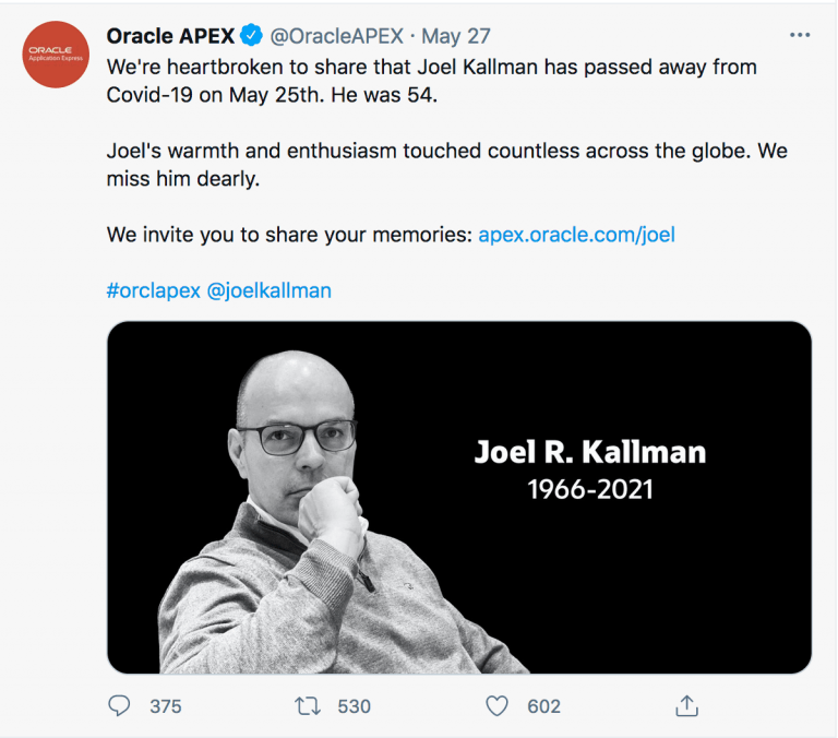 Oracle APEX tweeted on May 27 that Mr. Kallman “passed away from COVID-19.”