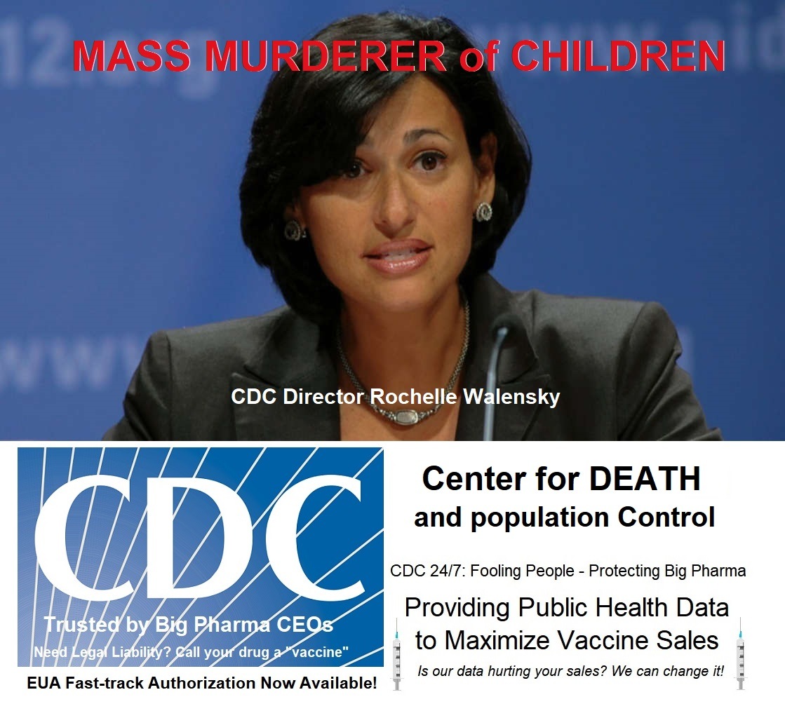Rochelle Walensky, the current director of the criminal organization and marketing arm of the pharmaceutical industry, the CDC, which should be renamed more appropriately as the Center for DEATH and population Control, has committed crimes against humanity by heading up a program to kill, maim, and render infertile Americans’ children between the ages of 12 and 17.