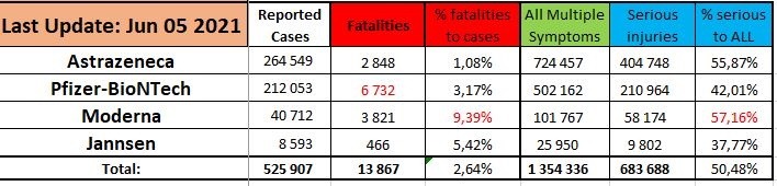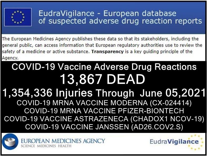 Their report through June 5, 2021 lists 13,867 deaths and 1,354,336 injuries following injections of four experimental COVID-19 shots: