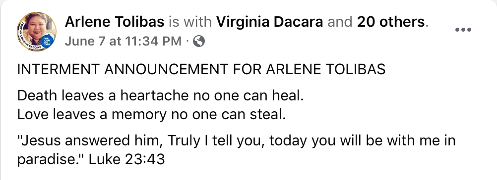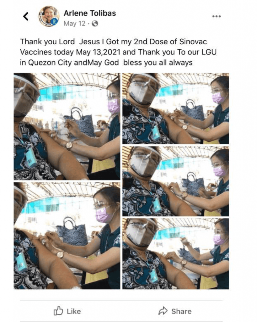 Ms. Arlene Tolibas received her second dose of the Chinese experimental Sinovac Coronavac “inactivated virus” shot on May 13, according to her Facebook page. She thanked Jesus and the local government for the injections.