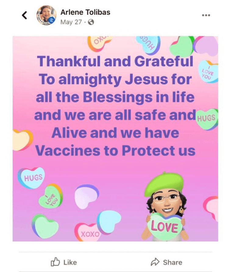 Both of the foregoing posts have since been deleted, or at least are now well-hidden. Her entire Facebook page is a bit strange, as the same video is posted numerous times on May 28 and 29, making it very difficult to scroll through her posts before that day. We received these screenshots from one of our readers. Ms. Tolibas was very active on Facebook in the last days of May, with many posts referencing her Christianity and Jesus.