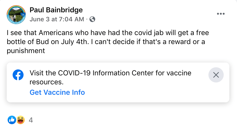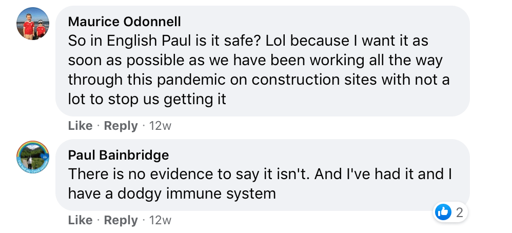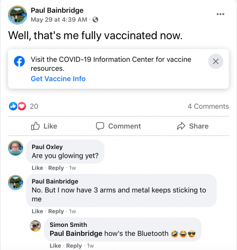 A friend of Mr. Bainbridge named Paul Oxley asked “are you glowing yet” after the second AstraZeneca dose. Mr. Bainbridge responded, “No. But I have 3 arms and metal keeps sticking to me.”
