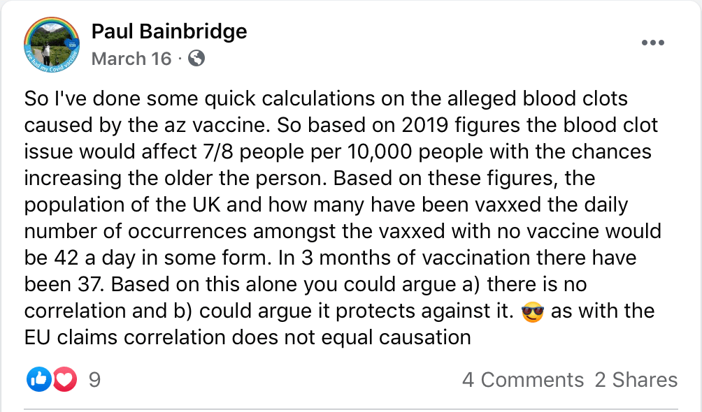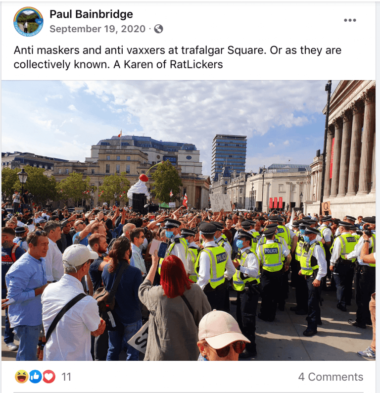 Mr. Bainbridge has posted many statements since 2020 showing his loyalty and obedience to anything the World Health Organization and big pharma tell him. He confirmed that he received the AstraZeneca shot in a comment on his March 16 post.
