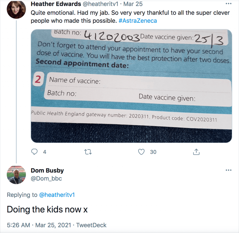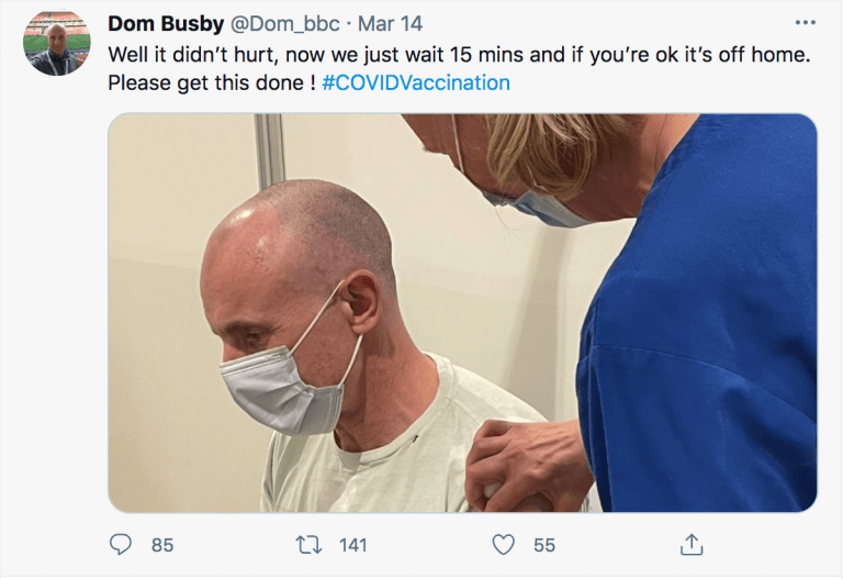 Mr. Dom Busby received the first dose of experimental AstraZeneca viral vector DNA on March 14, according to his Twitter page. He not only posted photos of himself receiving the injection, but also implied that his children would be getting injected as well.