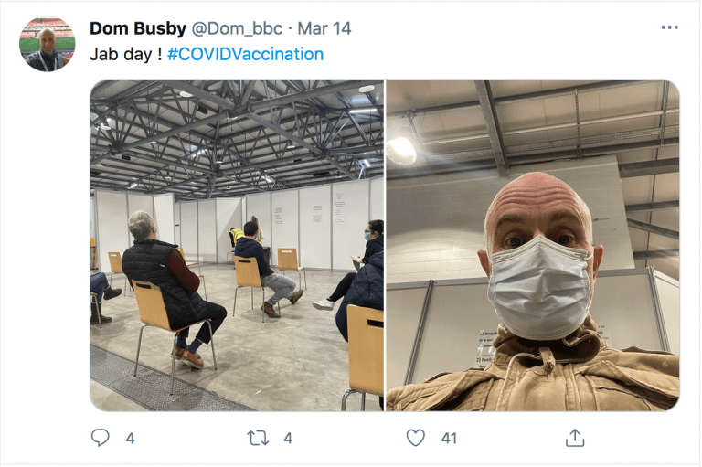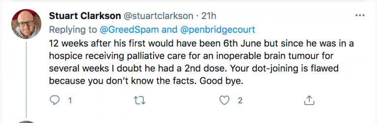 Mr. Busby was naturally very active on Twitter because of his profession as a sports reporter. He tweeted or re-tweeted 93 times in March, then 22 times from April 1 to April 10. He completely vanished thereafter. The United Kingdom recommends 12 weeks between AstraZeneca doses. Thus Mr. Busby would have been due for his second shot on or around June 14.