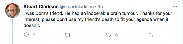 The BBC reported that Mr. Busby passed away on June 10 after a “short illness.” No further details were given. But a colleague and friend of his named Stuart Clarkson said Mr. Busby died from an inoperable brain tumor. Clarkson also said Mr. Busby was in palliative care for weeks, meaning his death was expected for quite some time. Clarkson is also adamant about deflecting all attention away from the AstraZeneca injection.