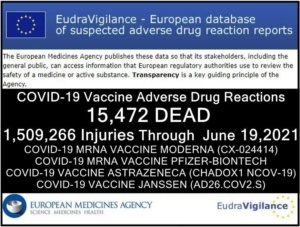 The EudraVigilance database reports that through June 19, 2021 there are 15,472 deaths and 1,509,266 injuries reported following injections of four experimental COVID-19 shots: