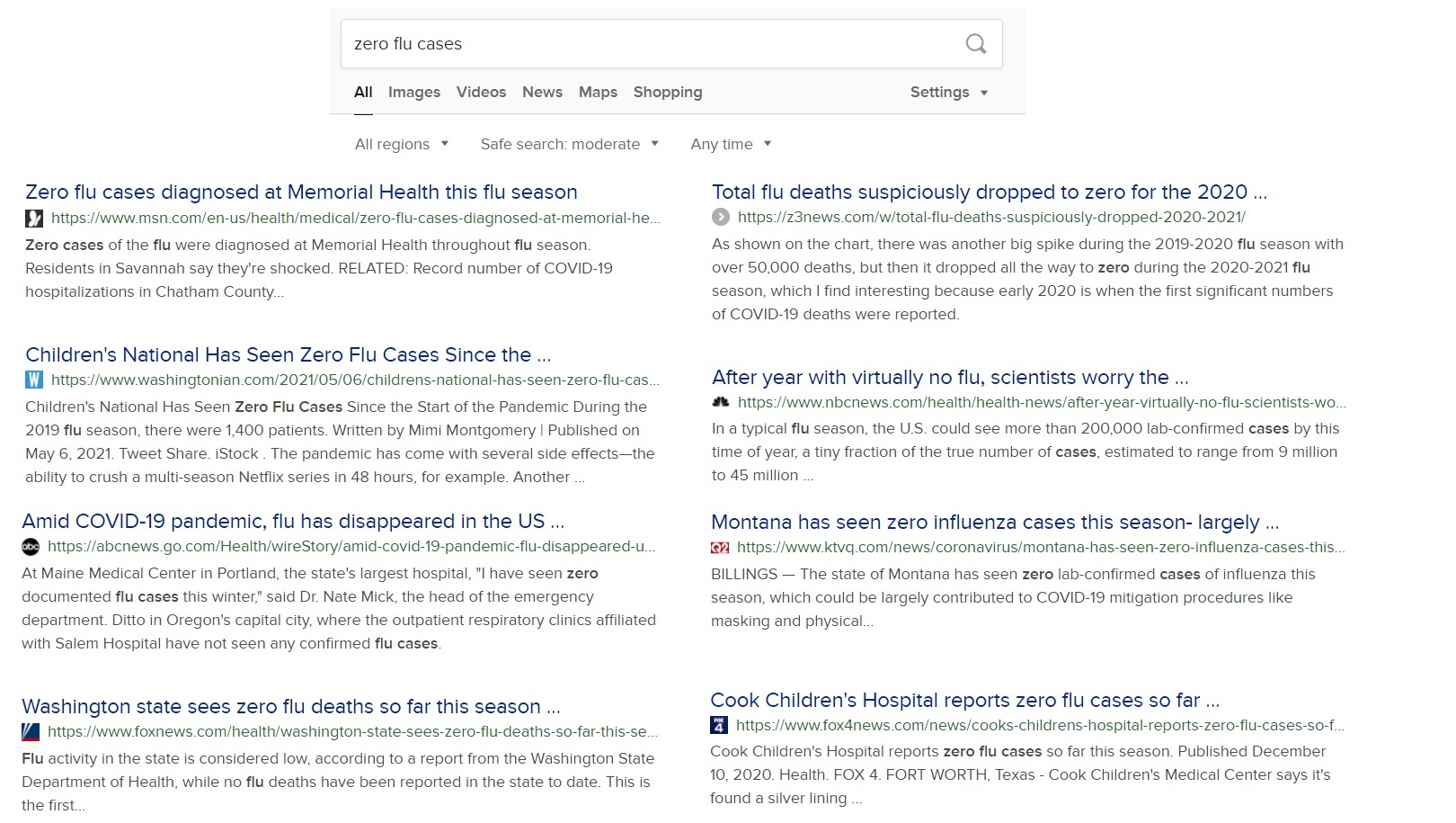 The first 9 results found articles reporting zero cases of the flu this year, while the 10th result was a “fact checking” article stating that reports on Facebook stating that there were zero cases of flu this year were FALSE.