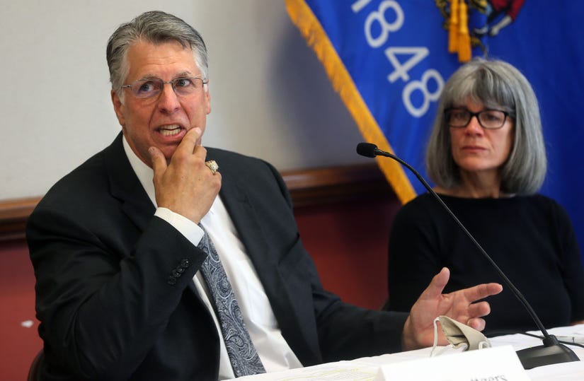 Former Green Bay Packer Ken Ruettgers, left, touches his face while sharing about the numbness and tingle feelings he said his wife Sheryl, right, experienced after receiving the first dose of the Moderna vaccine in January 2021. According to her she continues to experience neurological reactions that inhibit her day to day quality of life. Image Source.