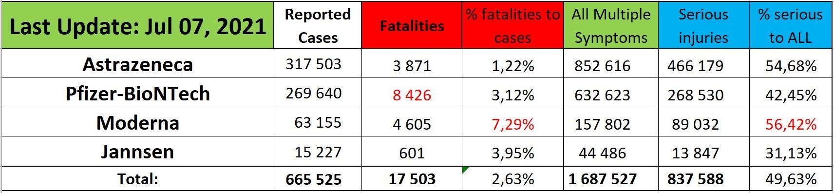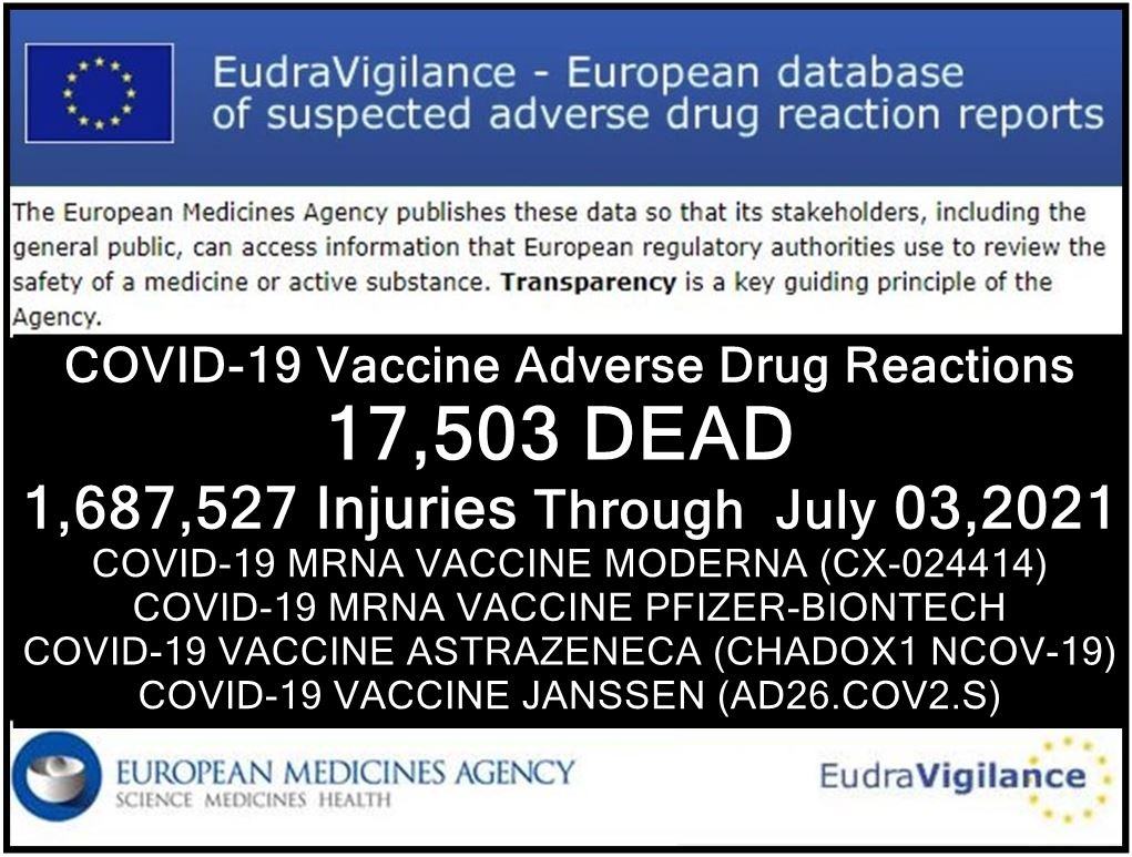 The EudraVigilance database reports that through July 3, 2021 there are 17,503 deaths and 1,687,527 injuries reported following injections of four experimental COVID-19 shots: