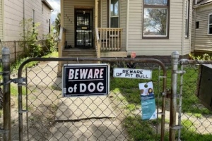 Fences, locked gates and especially dogs keep canvassers from getting on porches and making critical face-to-face contact. (BridgeDetroit photo by Martina Guzmán [1])