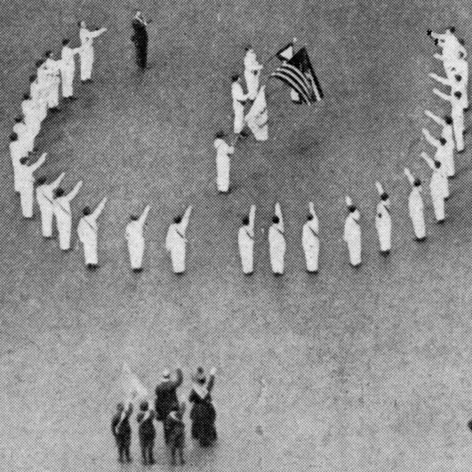 Saluting the American flag in a ceremony which took place in Fifth Avenue, New York, opposite the Union League Club in 1917. The formation is similar to what is seen in certain Satanic rituals. Image source.