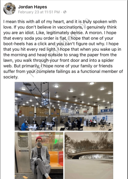 The since-deleted Facebook post appears to show a photo of a vaccine clinic. Mr. Hayes not only said that the non-vaccinated are failing society, but also called them “idiots” and “morons.” He emphasized that his message was being spoken “with all of my heart.”
