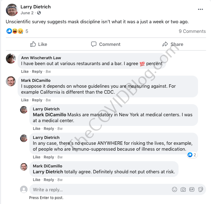 Mr. Dietrich suffered no apparent adverse reactions. Or at least he did not talk about them on social media. But he was a loyal mask-wearer to the end, implying on June 2 that those who do not wear masks over their nose and mouth put others at risk.