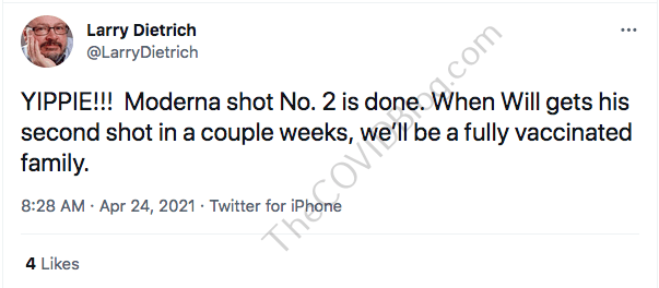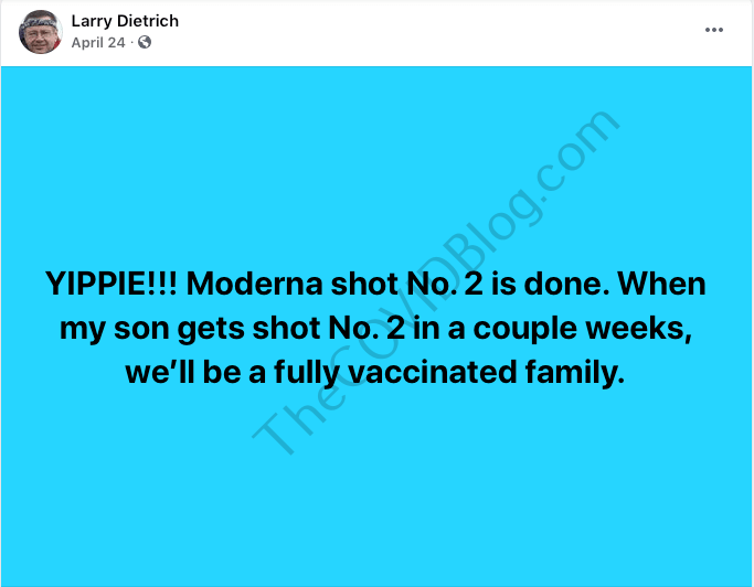 Mr. Larry Dietrich received his second experimental Moderna mRNA injection on April 24, according to his Facebook page. He also announced the injection on Twitter. Mr. Dietrich celebrated being a “fully vaccinated” family once his son received injection number-2. Friends and colleagues, some of whom referred to themselves as “Moderna groupies,” celebrated the “great feeling” of being fully-vaccinated.