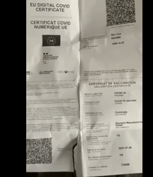 Mr. Maxime Beltra received the first dose of experimental Pfizer mRNA on Monday, July 26 at around 2 p.m. local time, according to a video by his father, Frédéric Beltra. The image of the EU Digital COVID certificate is a bit hard to read because it’s a screenshot from a video. But you can clearly see Maxime’s name on the top right and the date on the bottom right.
