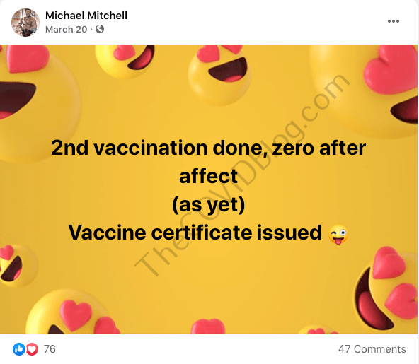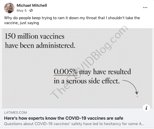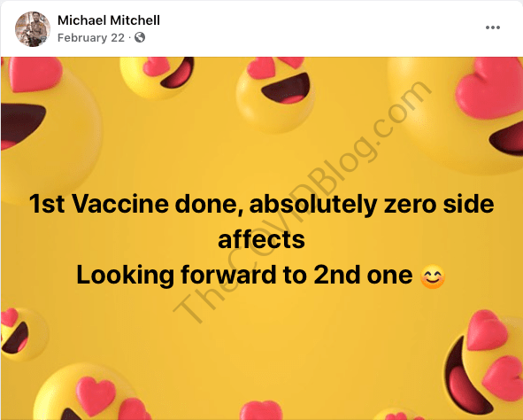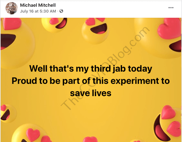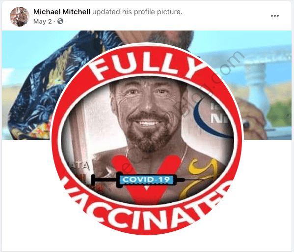 He posted the proverbial “fully vaccinated” banner on his profile photo on May 2. His May 5 update responded to people telling him he should not have received the experimental injections. Mr. Mitchell posted disinformation, saying that only 0.005% of all recipients of experimental injections suffered adverse reactions.