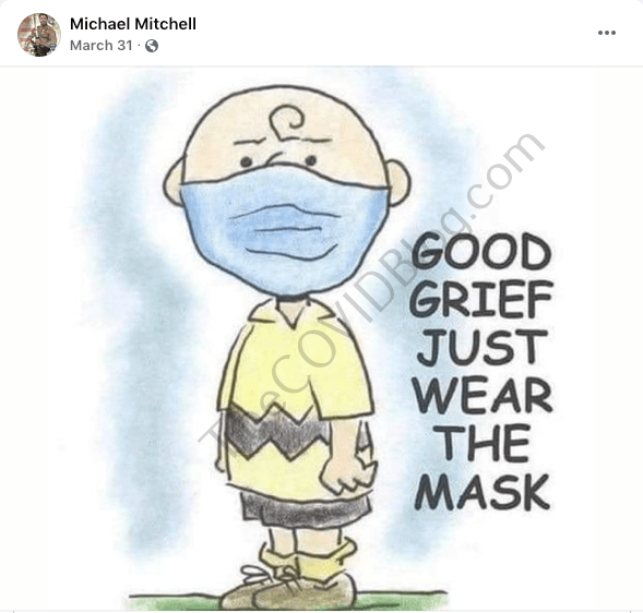 Note that Mr. Mitchell’s entire Facebook page was scrubbed of all posts sometime this past weekend. Only one post remains – his wedding announcement from 2013. But the virtue signaling was very strong after the second injection. Mr. Mitchell posted an image of Charlie Brown on March 31 that said “Good grief, just wear the mask.”
