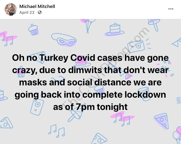 He wrote on April 22 that COVID cases were up in Turkey because of “dimwits that don’t wear masks and social distance.”