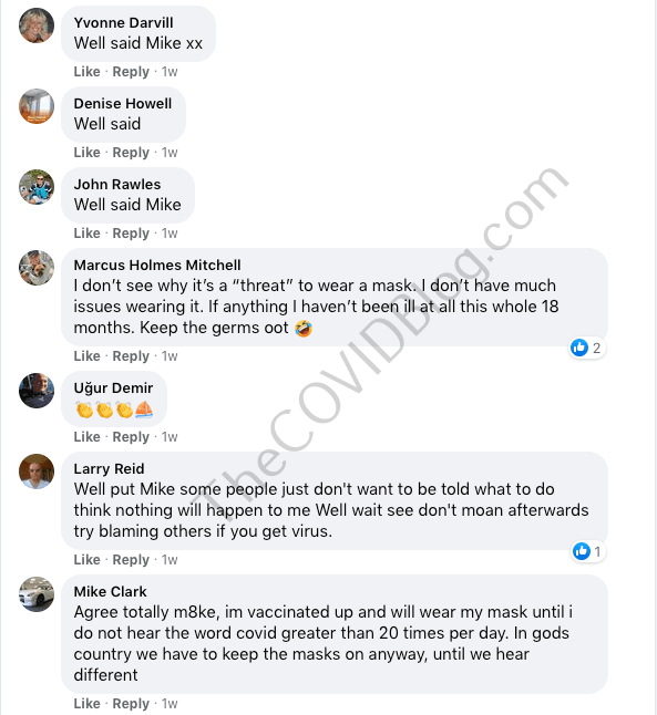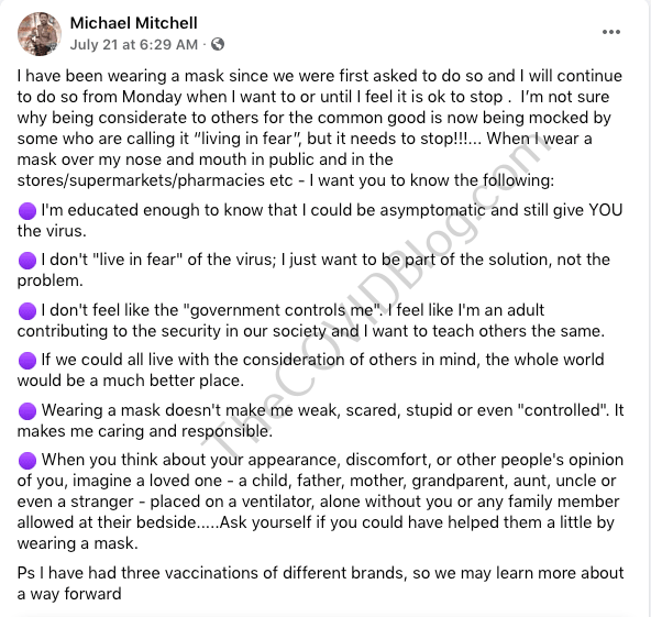 Mr. Mitchell said, among other things, that wearing a mask isn’t a sign of weakness, but instead shows he is “caring and responsible.” Several of his friends agreed and commented accordingly.