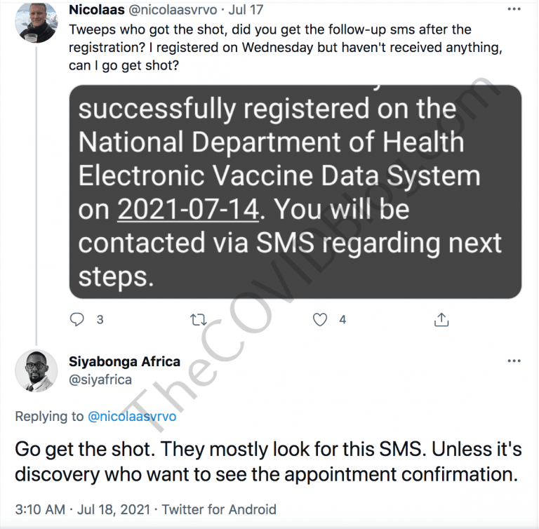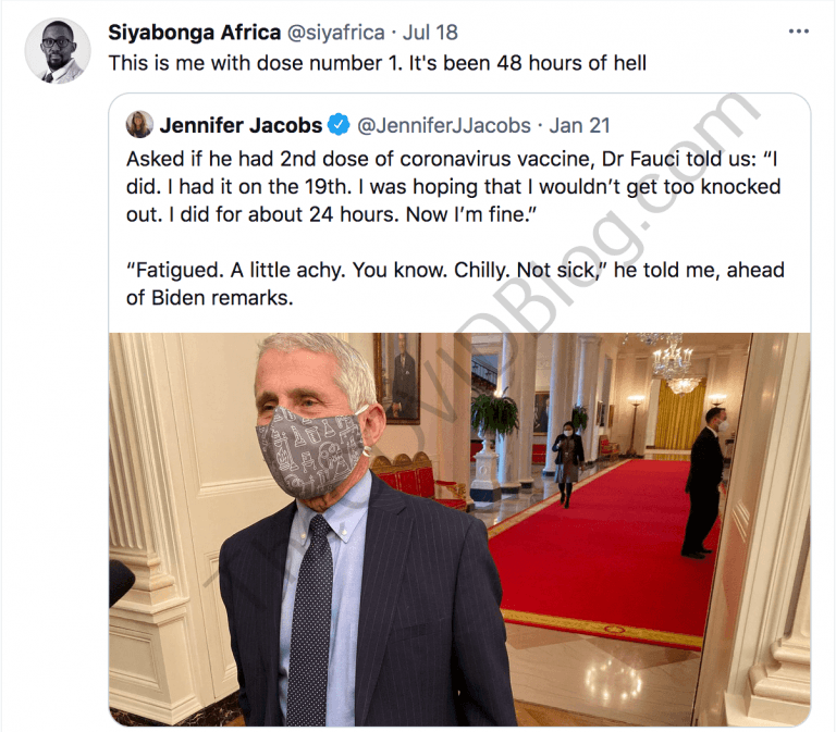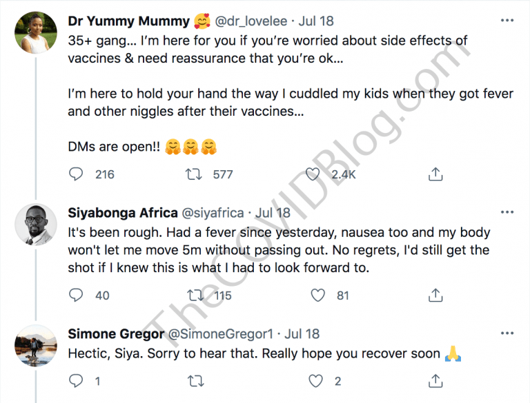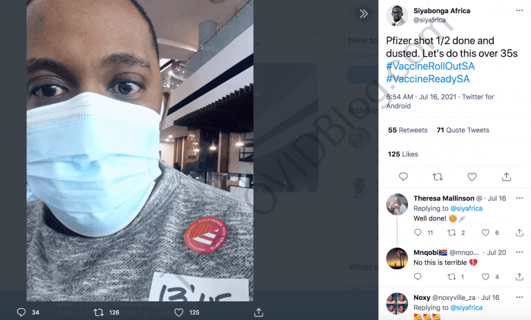 Mr. Siyabonga Africa received his first dose of experimental Pfizer mRNA on Friday, July 16, according to his Twitter account. The first two comments on the tweet were a woman telling him “well done,” and another woman with party emojis.