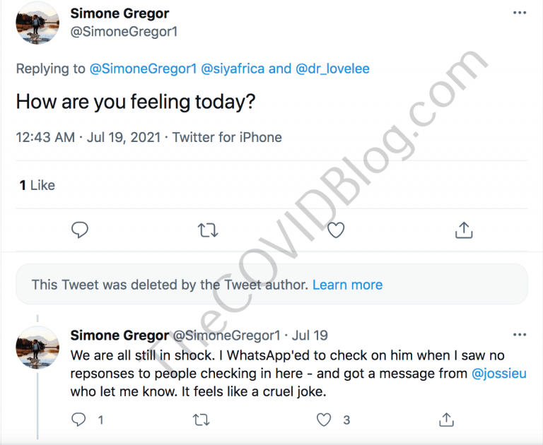 Simone Gregor, his friend/colleague, wished him a speedy recovery. Ms. Gregor replied again on Monday, July 19 and asked “how are you feeling today?” When he didn’t respond, she tried sending him a message on WhatsApp.
