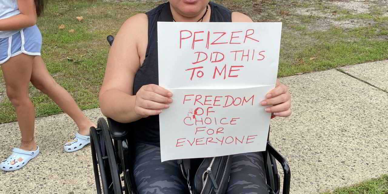 WOMAN AT VACCINE MANDATE PROTEST SAYS PFIZER VACCINE MADE HER WHEELCHAIR BOUND