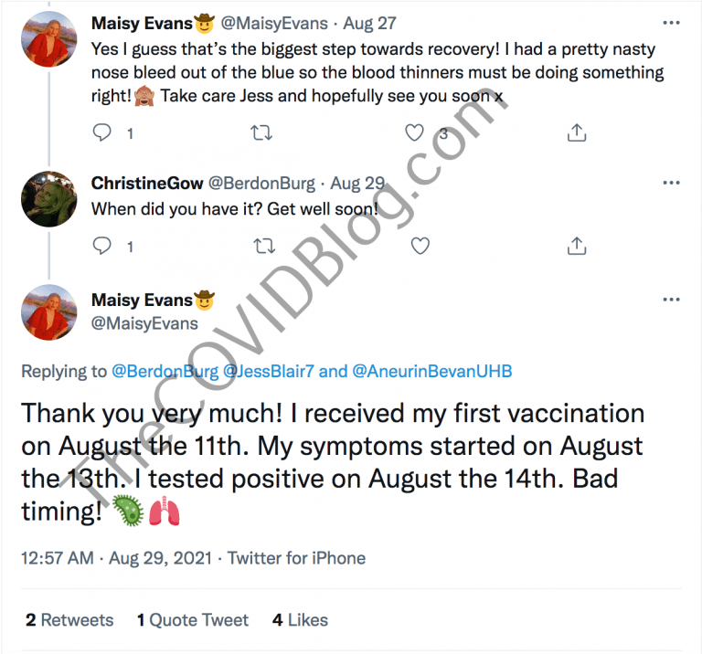 Ms. Maisy Evans received her first experimental mRNA injection on August 11, according to her Twitter page. It is unclear which injection she received. But only Pfizer, Moderna and AstraZeneca are used in Wales. AstraZeneca is only being offered to people over age 40, according to Wales Online. Thus Ms. Evans received the Pfizer injection, which is the only one authorized in the U.K. for children under age 18.