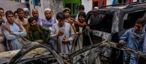 Relatives and neighbors of the Ahmadi family gathered around the incinerated husk of a vehicle hit by a U.S. drone strike in Kabul, Afghanistan on August 30, 2021. (Photo: Marcus Yam/Los Angeles Times via Getty Images)