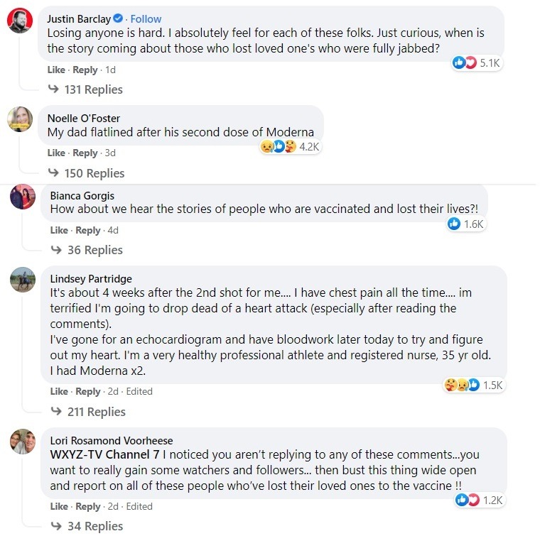 WXYZ TV Channel 7 in Detroit asked their viewers on their Facebook Page last Friday to direct message them if they lost a loved one due to COVID-19 if they refused to get one of the COVID-19 vaccines.