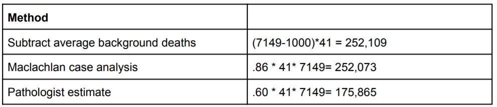 In the second method, McLachlan examined 250 VAERS reports in detail and concluded that up to 86% of the deaths were consistent with the vaccine being causal for the death. We use the higher number, because using a lower number makes no sense since it leads to a background death rate that would be excessive compared to previous years (.14*7149 = 1,000 which is already higher than the 500/yr background death rate).