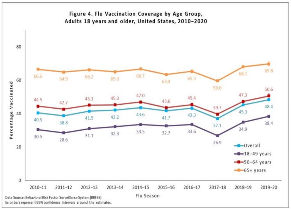 In the first method, we used 500 background deaths as normal for a year since the propensity to report is the same this year as in previous years as shown earlier. However, we should assume that the age cohort is older this year than previous years. For example, here are the vaccination rates shown in a CDC report for influenza: