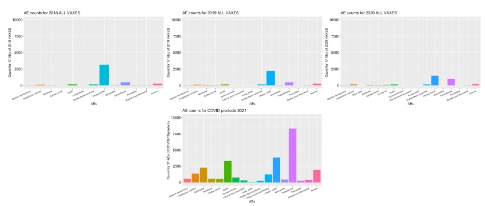 A third way to see that 2021 isn’t simply over-reporting normal background adverse events is to look at the “adverse event (AE) footprint” of the vaccine. You do that by listing adverse events on the X-axis and AE counts on the Y-axis. If there is over-reporting this year, the overall outline of the boxes will be exactly the same as previous years, and they will just be higher due to the higher propensity to report the same types of events. As you can see, that is not the case here.