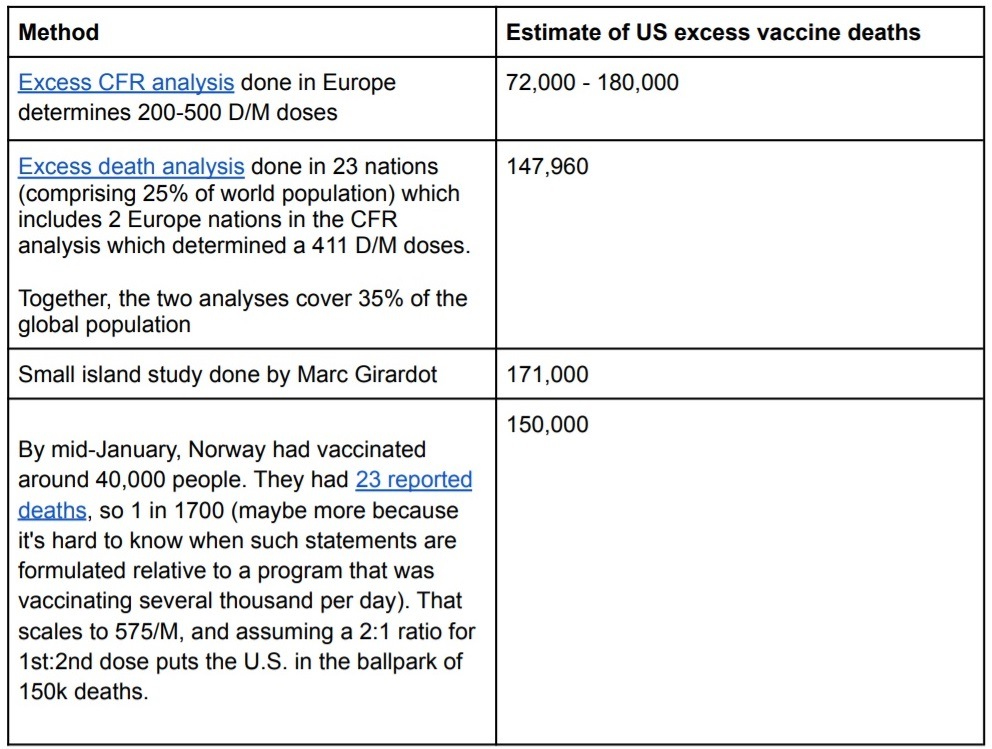 There are three ways to estimate the number of excess deaths caused by the vaccine. Using these three methods we can estimate the low and high likely bounds for the number of excess deaths caused by the vaccine: