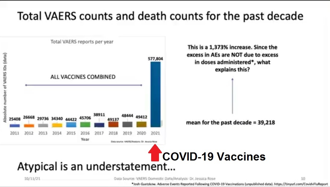 She recently made a presentation to the World Council for Health, and her analysis of the data in VAERS revealed that in 2021 there has been a 5,427% increase in deaths following COVID-19 shots, and a 1,373% increase in adverse reactions following COVID-19 shots, as compared to all other vaccines given out for the past 10 years.
