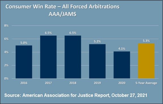 The above graphic from the study by the American Association for Justice shows how claimants faired in mandatory arbitration forums run by the American Arbitration Association (AAA) and JAMS. The findings cover a broad range of industries, not just Wall Street.