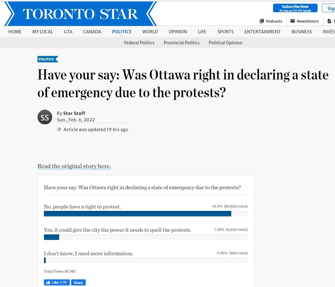 Toronto Star asks: “Was Ottawa right in declaring a state of emergency due to the protests?”