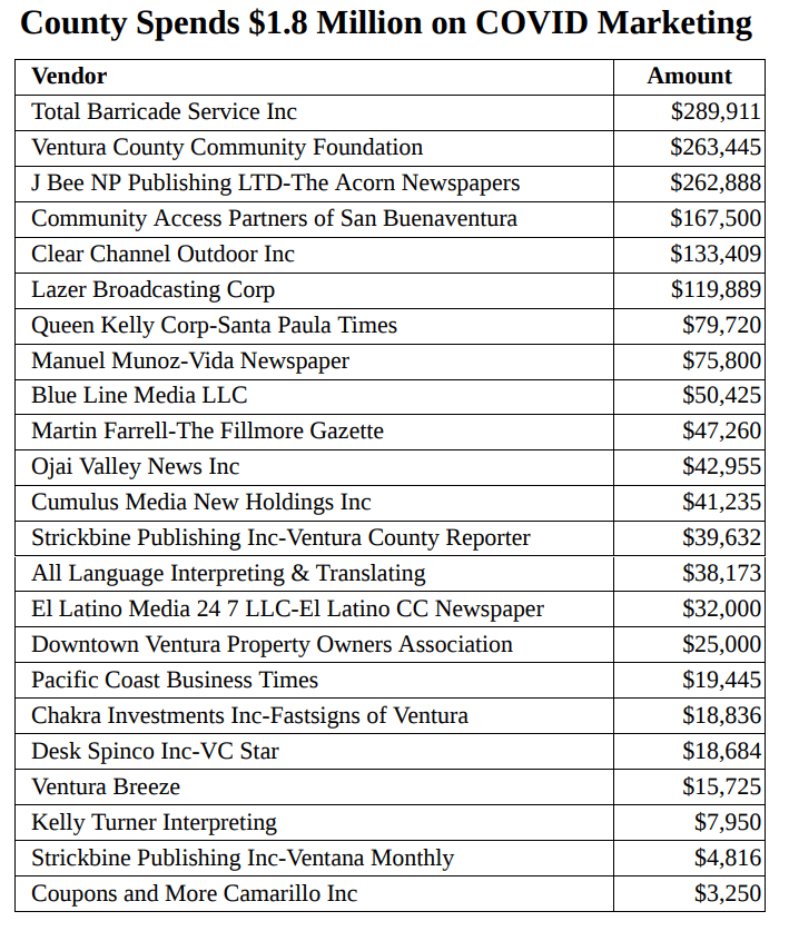 In January, the Conejo Guardian reported that $1.8 million of federal COVID money was used by Ventura County supervisors to buy positive local media coverage regarding business-shattering public health mandates.