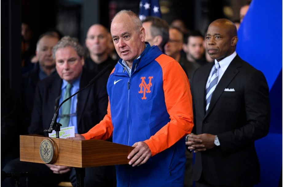 Randy Levine, the president of the New York Yankees (Left), Mets president Sandy Alderson (at podium), NYC Mayor Eric Adams (Right.) Image source.