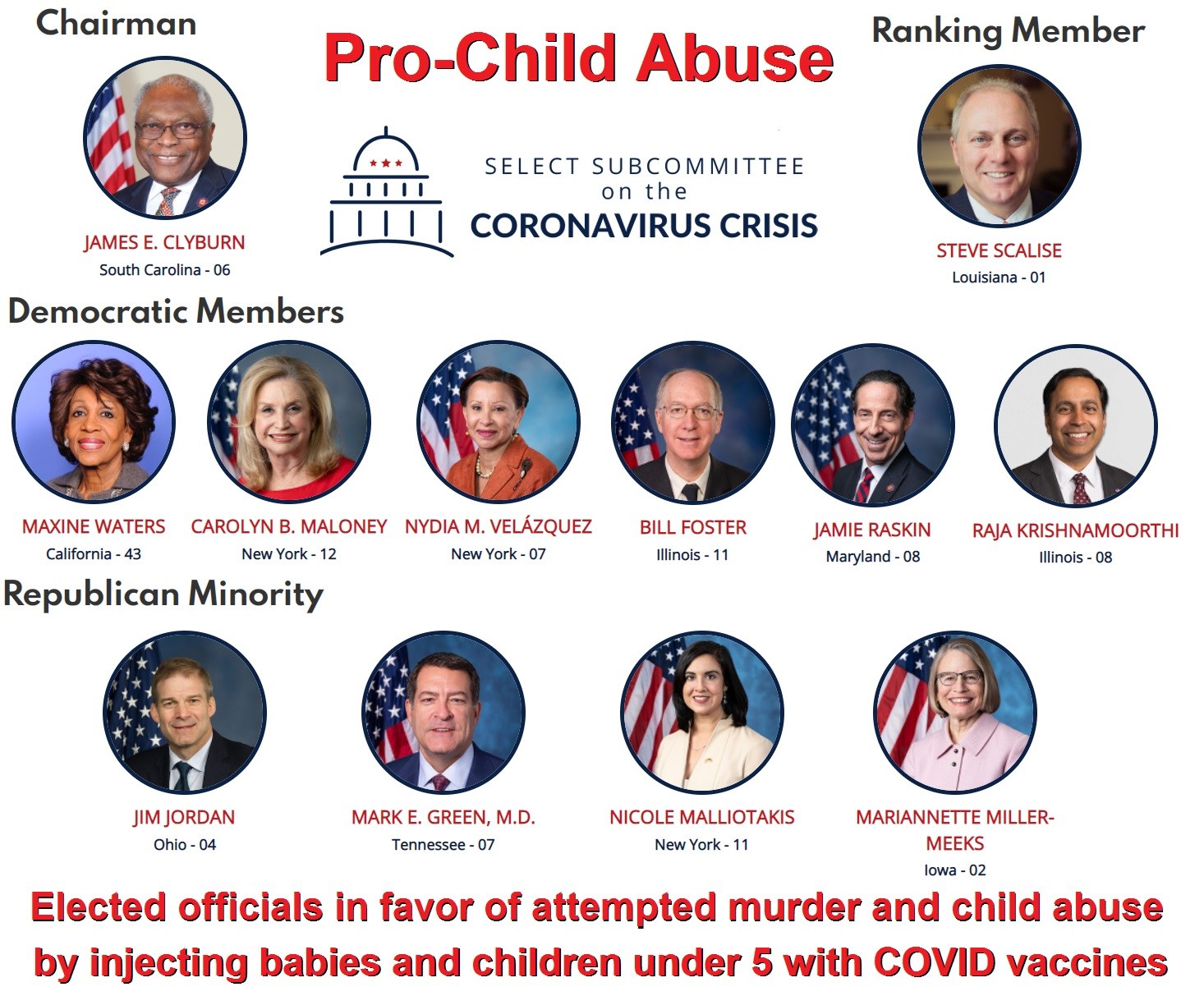 They are the members of the Select Subcommittee on the Coronavirus Crisis, originally setup in April of 2020 under then President Donald Trump, and they are upset that the FDA has not issued an EUA for babies and children under the age of 5 so that parents can attempt to murder and abuse their children with one of these deadly shots.