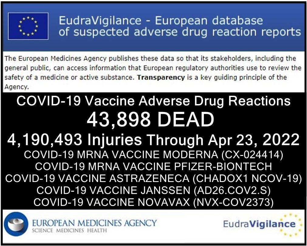 The European (EEA and non-EEA countries) database of suspected drug reaction reports is EudraVigilance, verified by the European Medicines Agency (EMA), and they are now reporting 43,898 fatalities, and 4,190,493 injuries following injections of five experimental COVID-19 shots: