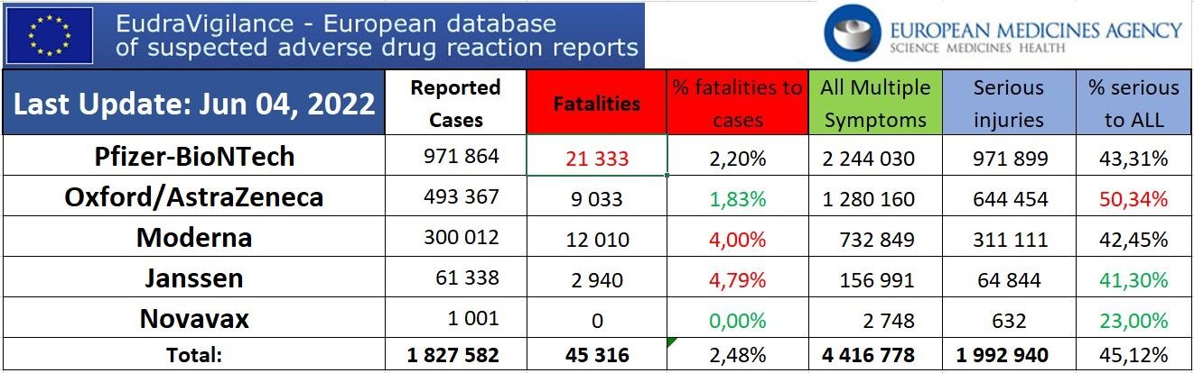 The European (EEA and non-EEA countries) database of suspected drug reaction reports is EudraVigilance, verified by the European Medicines Agency (EMA), and they are now reporting 45,316 fatalities, and 4,416,778 injuries following injections of five experimental COVID-19 shots: