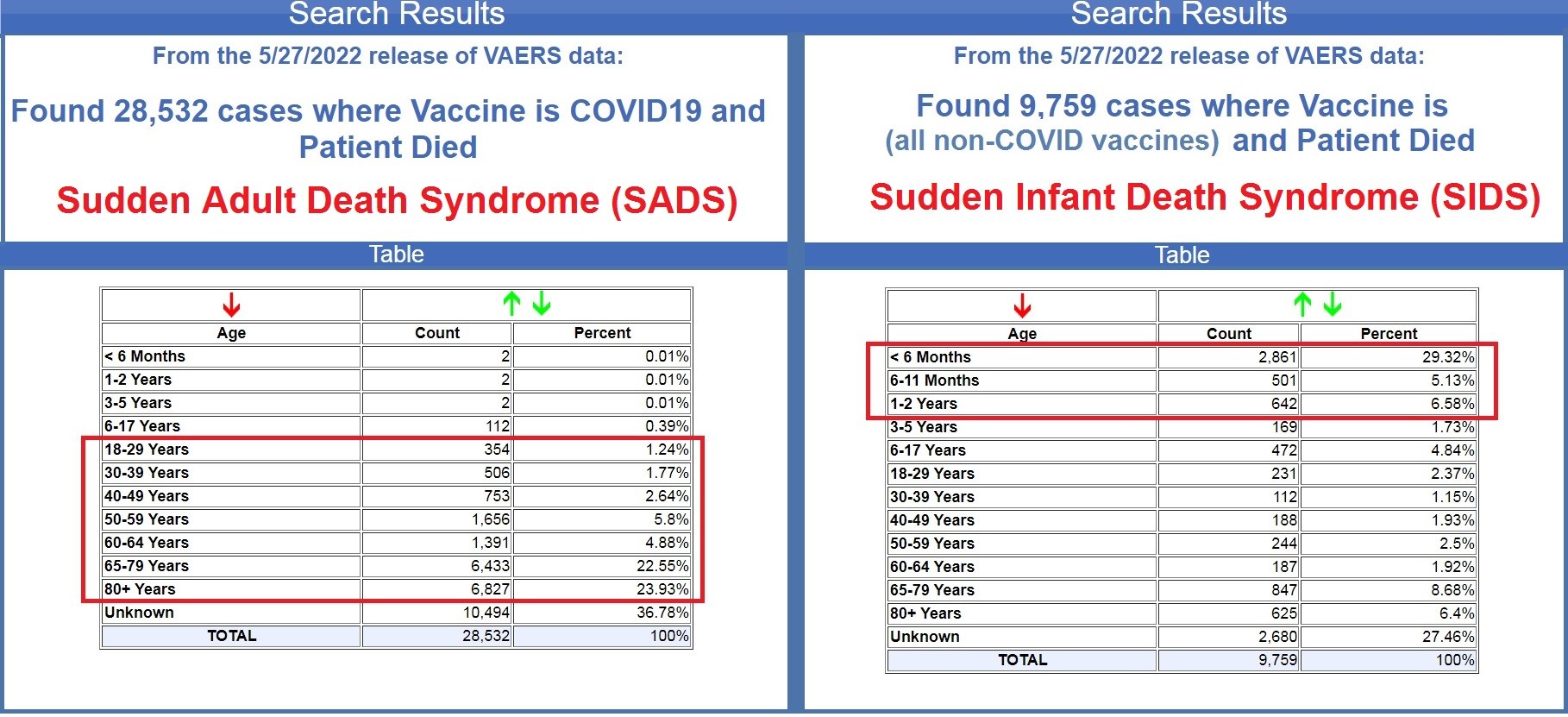 A quick search in the U.S. Government’s Vaccine Adverse Events Reporting System (VAERS) on deaths recorded following vaccination, will clearly show the correlation between FDA-approved vaccines for the past 30+ years, where the vast majority of deaths were among infants below the age of 6 months (source), in contrast to reported deaths following COVID-19 vaccines, where deaths among adults in the working class (ages 18 to 59) now exceed infant deaths for the past 30+ years, during the last 18 months. (Source.)