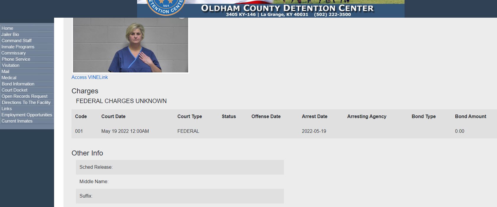 A search of the Oldham Detention Center for inmates shows she is still a current inmate and has allegedly not been released. http://www.oldhamcountyjail.com/InmateRoster/OCDC_inmatelist.html