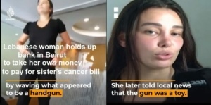 - On the same day, a woman called Sali Hafiz [8] entered a BLOM Bank branch in Beirut with what she later said was a toy gun, along with other activists, in order to retrieve money from her own account to fund hospital treatment for her cancer-stricken sister. She poured gasoline inside the branch and threatened to set it on fire if she did not receive her savings.