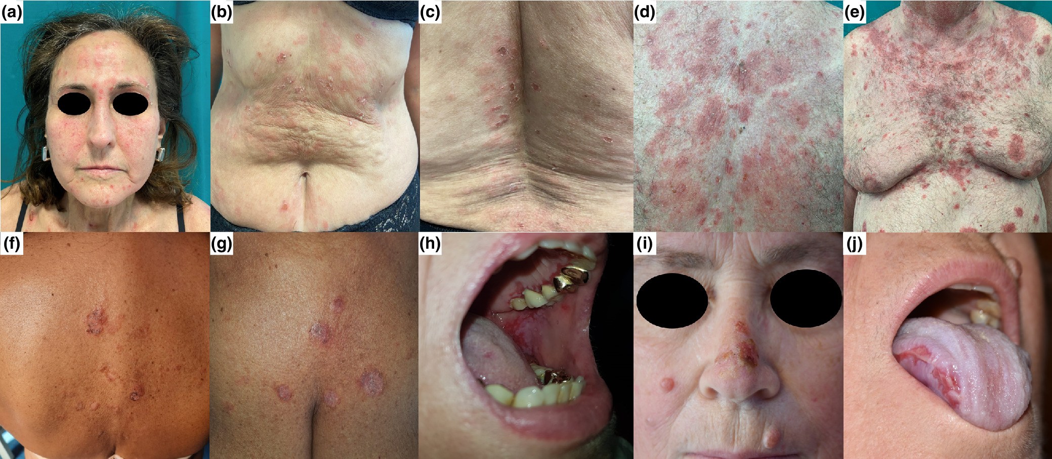 Clinical pictures of our cases. Case 1: scattered superficial blisters and erythematous patches with scaly erosions involving the face and lower trunk (a–c). Case 2: diffuse erythematous-squamous patches with scaly and crusted erosions involving the face and the trunk, following a seborrheic distribution (d, e). Case 3: a few erosive lesions, diffuse scales, and crusted erosions involving the trunk (f, g). Case 4: painful erosions on the gums and soft palate (h). Case 5: erosive lesions on the oral cavity, nose, right cheek, and abdomen (i, j).