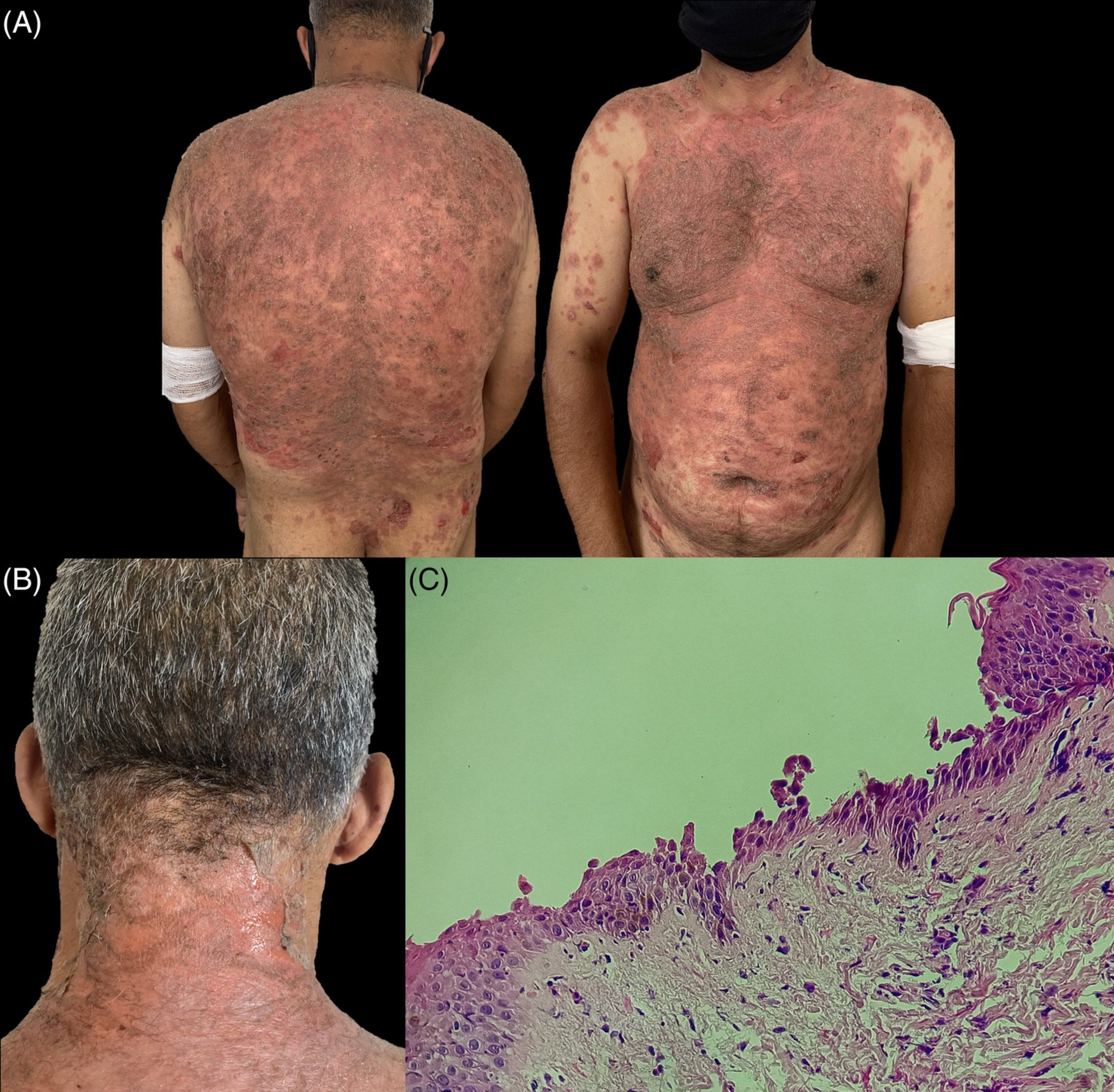 (A) Clinical examination on admission showing scales and crusts with erythematous bases and superficial blistering all over the trunk. (B) Large erosions of the neck after extension of the superficial detachment. (C) Histopathology of lesion showing subcorneal loss of adhesion with acantholytic cells