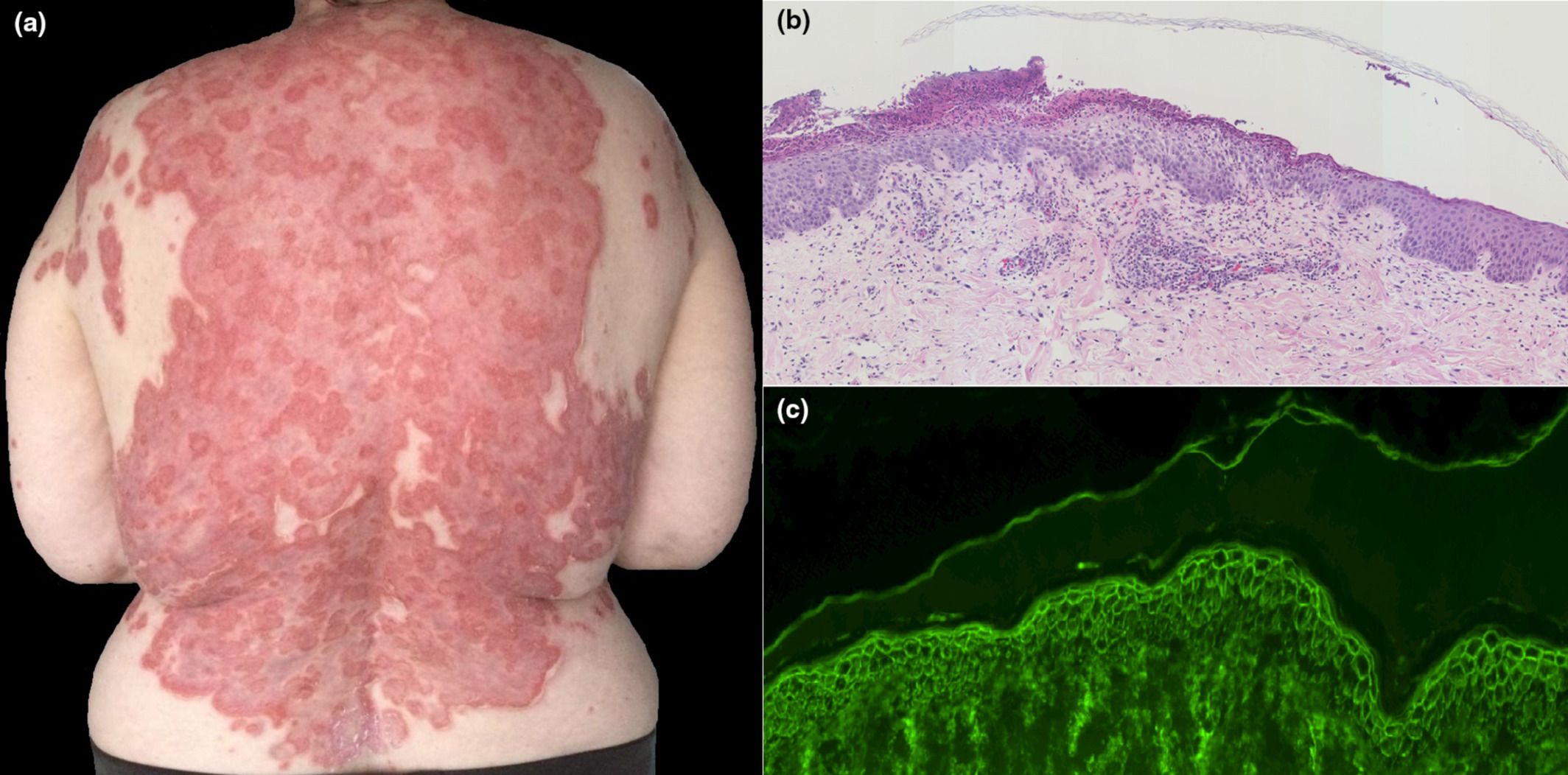 (a) Large erosive annular erythematous plaques on the back. (b) Histology of the skin shows subcorneal acantholysis and blister filled with neutrophils. The epidermis is infiltrated by a large number of neutrophils. H and E stain ×100 magnification. (c) Direct immunofluorescent staining shows intercellular IgG in the epidermis in a chicken wire-like pattern. IMF stain ×200 magnification.