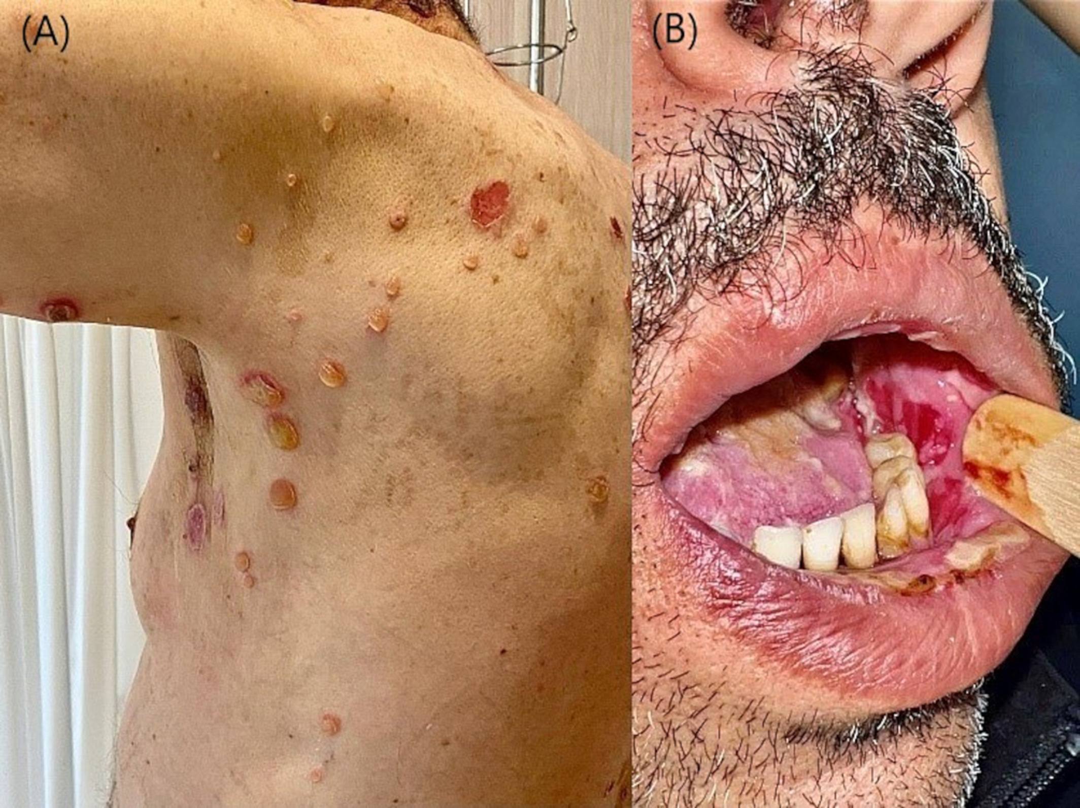 (A) Flaccid blisters on healthy skin with post-bullous erosions. (B) Post-bullous erosions of the oral mucosa