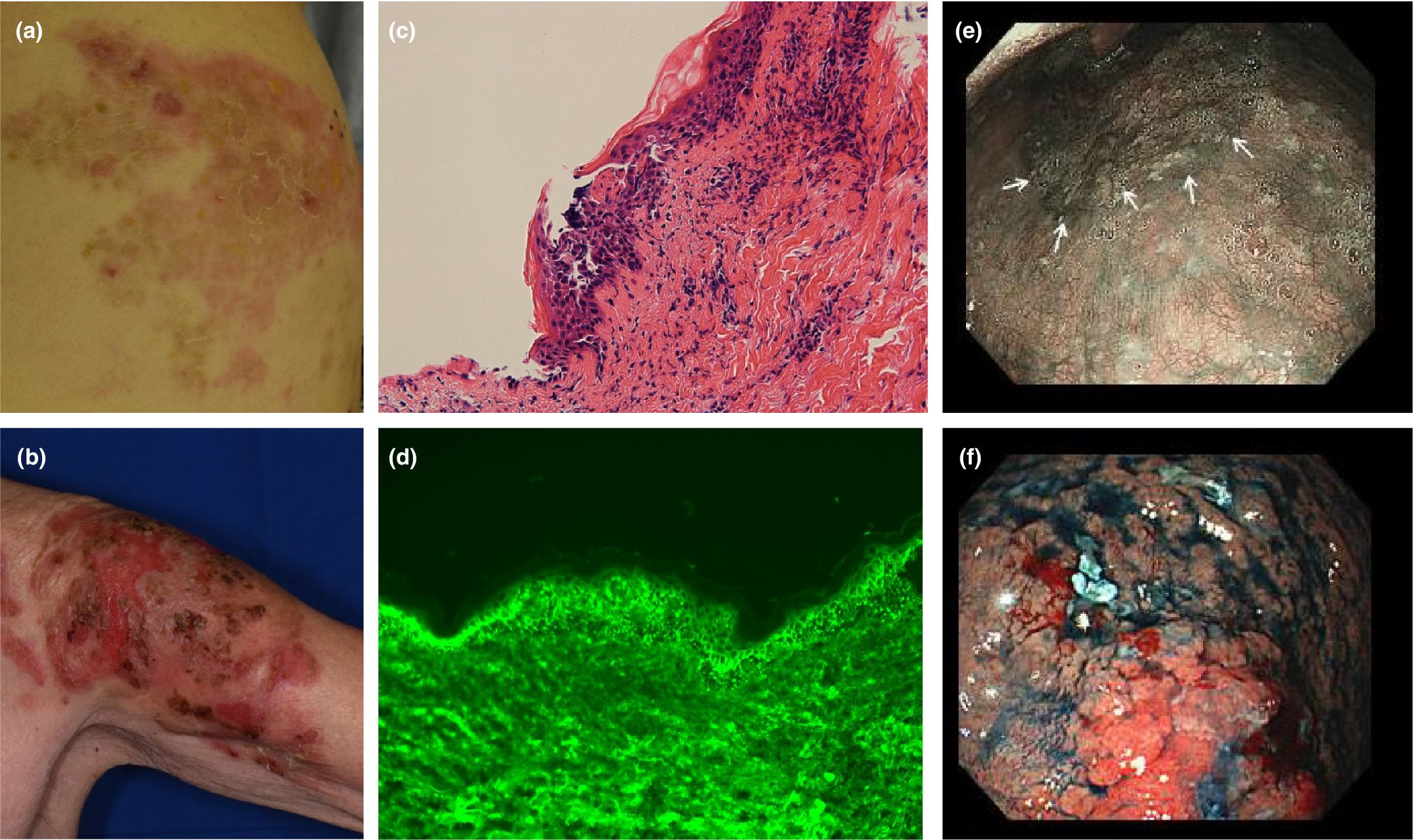Skin symptoms, histopathological findings of skin blister lesions and gastrointestinal endoscopic findings. Flaccid bullae with erythema on the right lumbar region (a) and left upper arm (b) at the time of our hospital visit. The histopathological sections, stained with hematoxylin and eosin, revealed intraepidermal blisters (magnification × 200) (c). Direct immunofluorescent staining of tissue sections from blister lesions demonstrated IgG deposition on keratinocytes (magnification × 400) (d). Hypopharyngeal cancer (e) and gastric cancer (f). The white arrows indicate the margin of hypopharyngeal cancer.